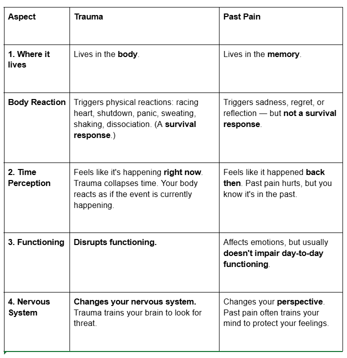 Past pain is real. It shapes your beliefs, expectations, and behaviors. But it doesn't typically create ongoing physiological threat responses. Past pain may make you feel sad or sensitive, but it usually doesn't impair day-to-day functioning.
